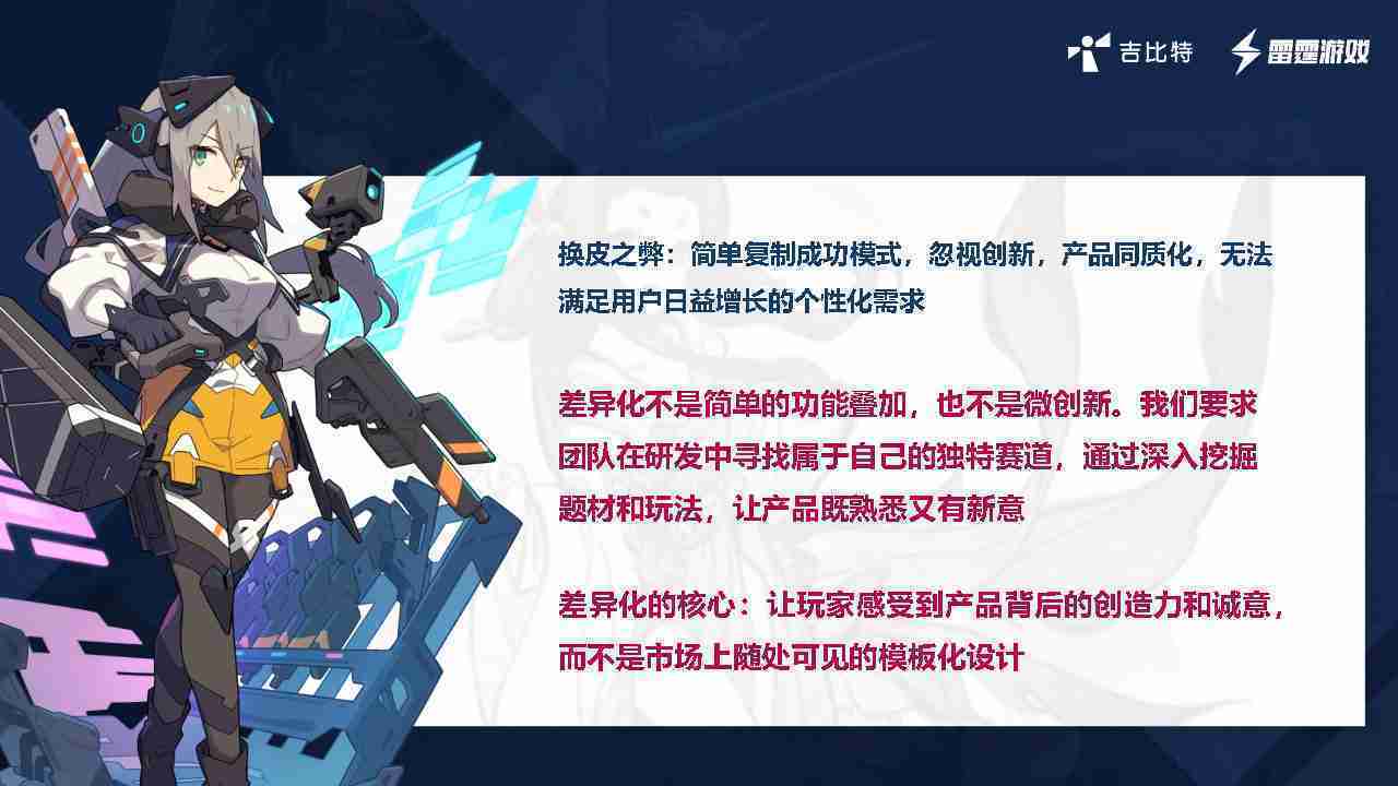 在我们内部是这么定义差异化的。。。。首先,,差异化不是简单的功能叠加,,,更不是换皮。。只是换皮,,产品无法提供有效的市场价值。。内部经常说差异化的产品不是为了迎合市场,,而是找到一个自己独特的表达方式,,,,在研发中找到属于自己的细分赛道和独特赛道,,前提是需要对这个题材有足够的深入、、、挖掘,,,对玩法有足够深入的理解,,让产品看起来既熟悉又有新意。。