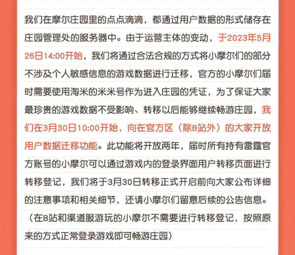 合作结束本就是开发方和代理方双方的事情,,,,降低这件事情对玩家的影响,,,,才是对所有珍视这段童年的摩尔玩家最好的呵护。。目前看来,,,,用户完全不用担心后续因无法登录游戏而造成任何数据上的损失,,,只要及时进行账号转移,,就可以好好保留、、、、延续在庄园的痕迹和回忆,,,,继续在庄园里做快乐的红鼻子小鼹鼠。。。。