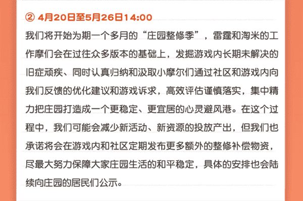合作的结束并不意味着这个童年IP的结束,,,对于《摩尔庄园》手游而言,,这是一个新阶段的开始。。。。后续游戏内将开启庄园重构计划,,会就以往遗留下来的BUG进行集中修复,,并在游戏内和社区定期发布更多补偿物资。。。